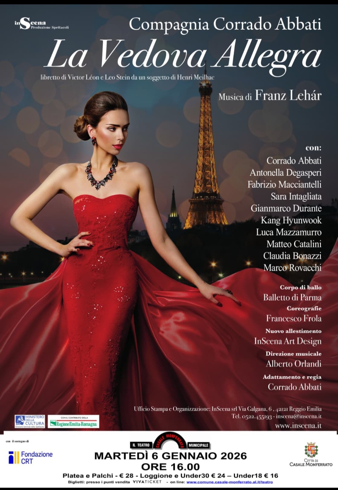 L’operetta “La Vedova Allegra” è in programma martedì 6 gennaio 2026 alle ore 16,00: ispirata al concetto di “leggerezza” di Calvino, questa edizione de La Vedova Allegra propone un allestimento fedele allo spirito dell’operetta, con musica di Franz Lehár, coreografie di Francesco Frola, regia e adattamento di Corrado Abbati, direzione musicale di Alberto Orlandi e il Balletto di Parma, privilegiando ritmo, eleganza e interazione con il pubblico.