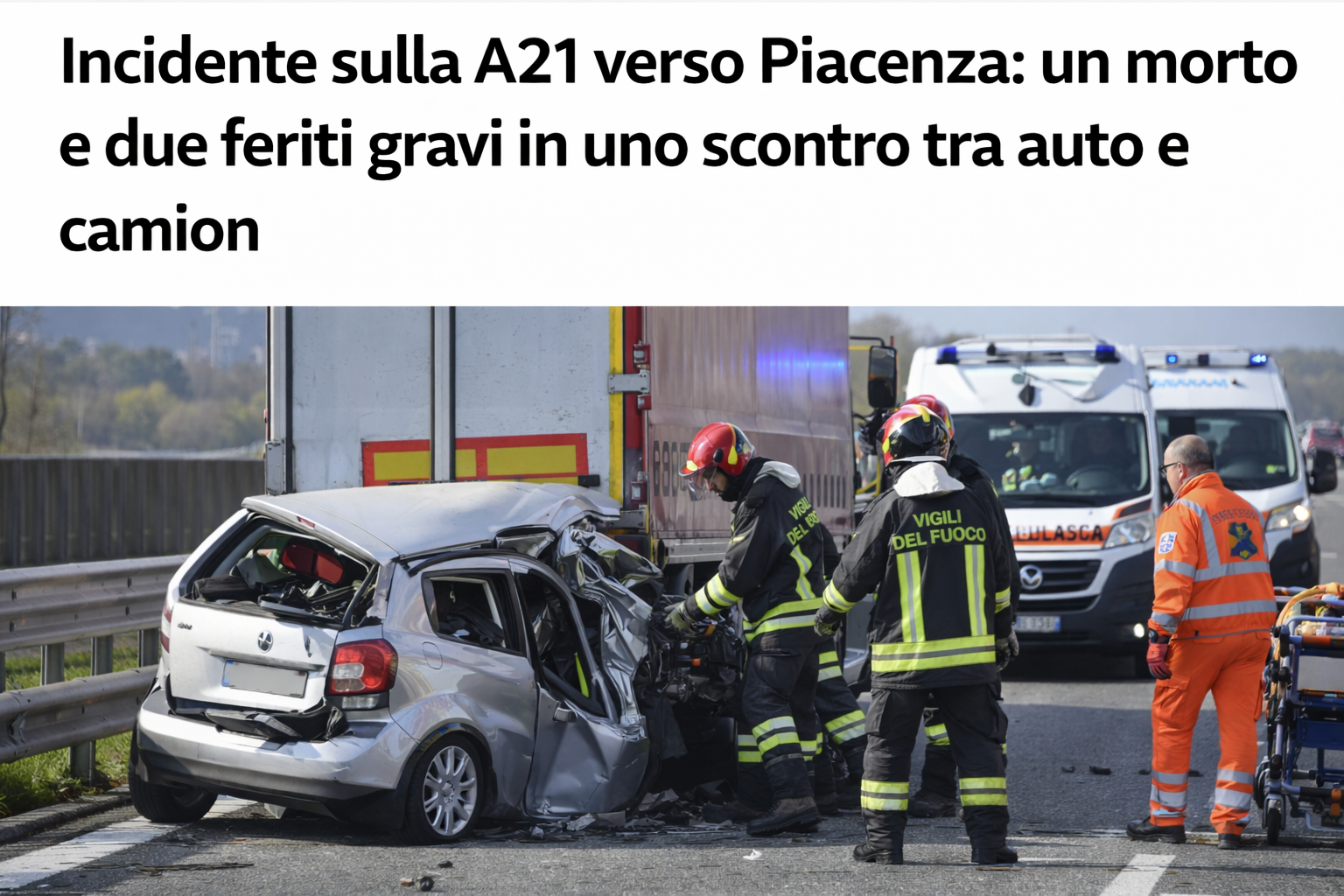 Un grave incidente stradale si è verificato oggi lungo l’autostrada A21, in direzione Piacenza, dove un’auto si è scontrata con un camion per cause ancora in corso di accertamento. Il bilancio è drammatico: una persona ha perso la vita, mentre altre due sono rimaste ferite in modo serio.