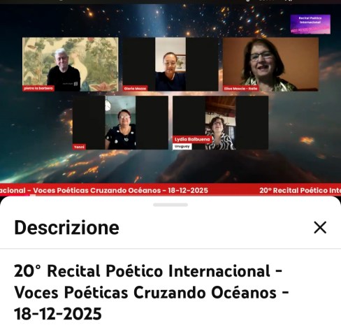 Foto screenshot dell’ inizio del XX Recital Poetico Internazionale “Voci Poetiche, Attraversando gli Oceani” Ciao … Leggi tutto Pietro La Barbera – Yanni Tugores ed Elisa Mascia hanno presentato il XX Recital Poetico Internazionale : “Voci Poetiche, Attraversando gli Oceani”, pubblicazione di Elisa Mascia -Italia